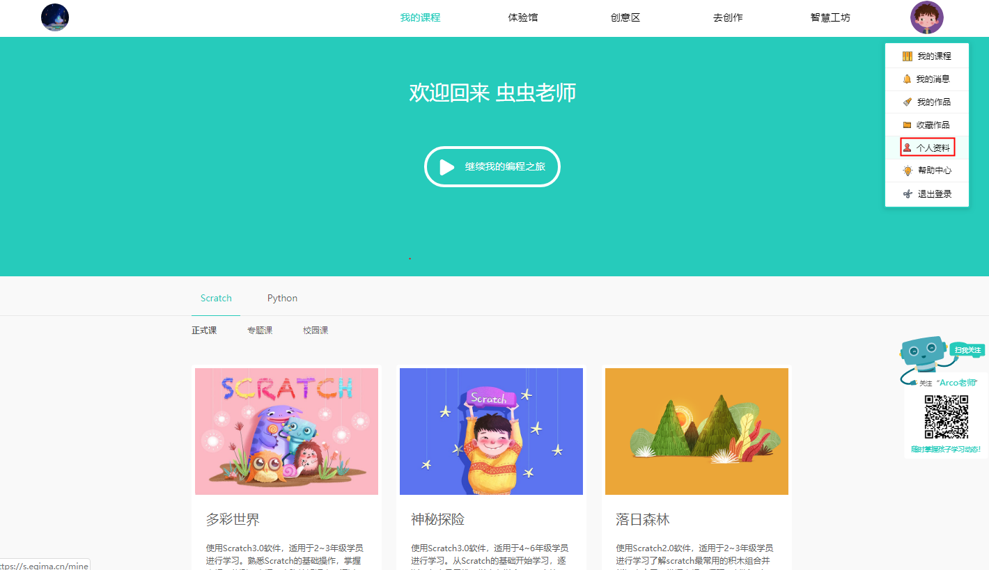 2. 进入个人资料页,微信扫码并关注Arco老师公众号, 如下图所示:
