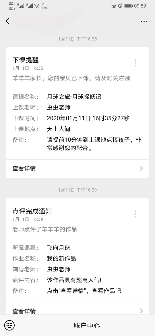 家校通功能简介:家校通功能可以让家长随时掌握孩子上课学习状态, 通过微信消息推送获取:孩子上课签到信息, 下课信息, 作品完成及评价信息,支持对孩子作品进行朋友/朋友圈分享。